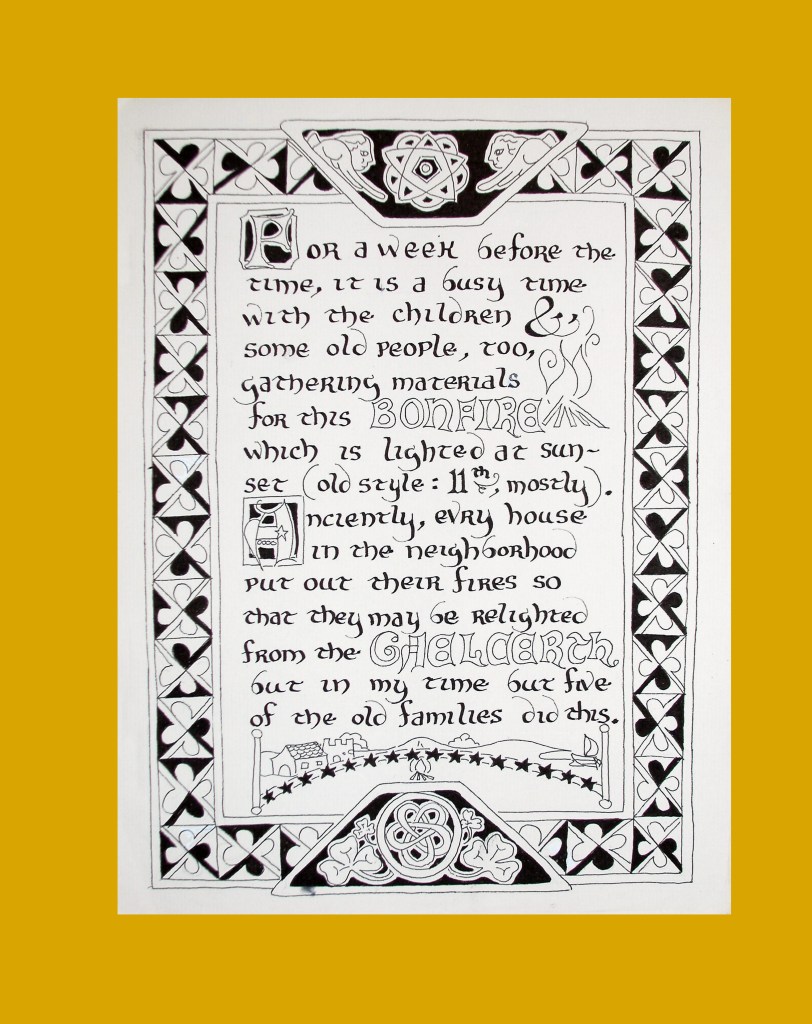 For a week before the time with the children & some old people , too, gathering materials for this bonfire which is lighted at sunset (old style: 11th, mostly). Anciently , every house in the neighborhood put out their fires so that they could be relighted from the Galecerth but in my time but five of the families did this.