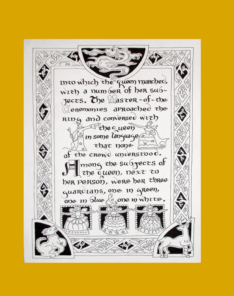 Then he described how the Queen of the Fairies entered with her subjects and guardians.