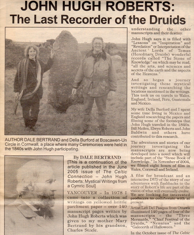 ” Druidical Quest” is an intuitive journey to discover the meaning of mystical “Druid manuscripts”, and the “Stones of Knowledge”. Tales and revelations are recorded by John Hugh Roberts (1828-1917) — “Recorder of the Druids” such as “The Three Mermaids” , and “Chief Festival of the Druids”. Dale Bertrand author of “Druidical Quest” and Della Burford who with Dale are co-adventurers and co-producers of the video journeyed to Sacred Stone sites all over the world to understand the connections and meanings within. They were recorded by photo, film and poems at Avebury, New Grange, Bocsacwen-Un, Land’s End, Bardsey Island, Chichen-Itza, and Machu Picchu and many other sacred locations which are power points of the earth… such as Stonehenge.
